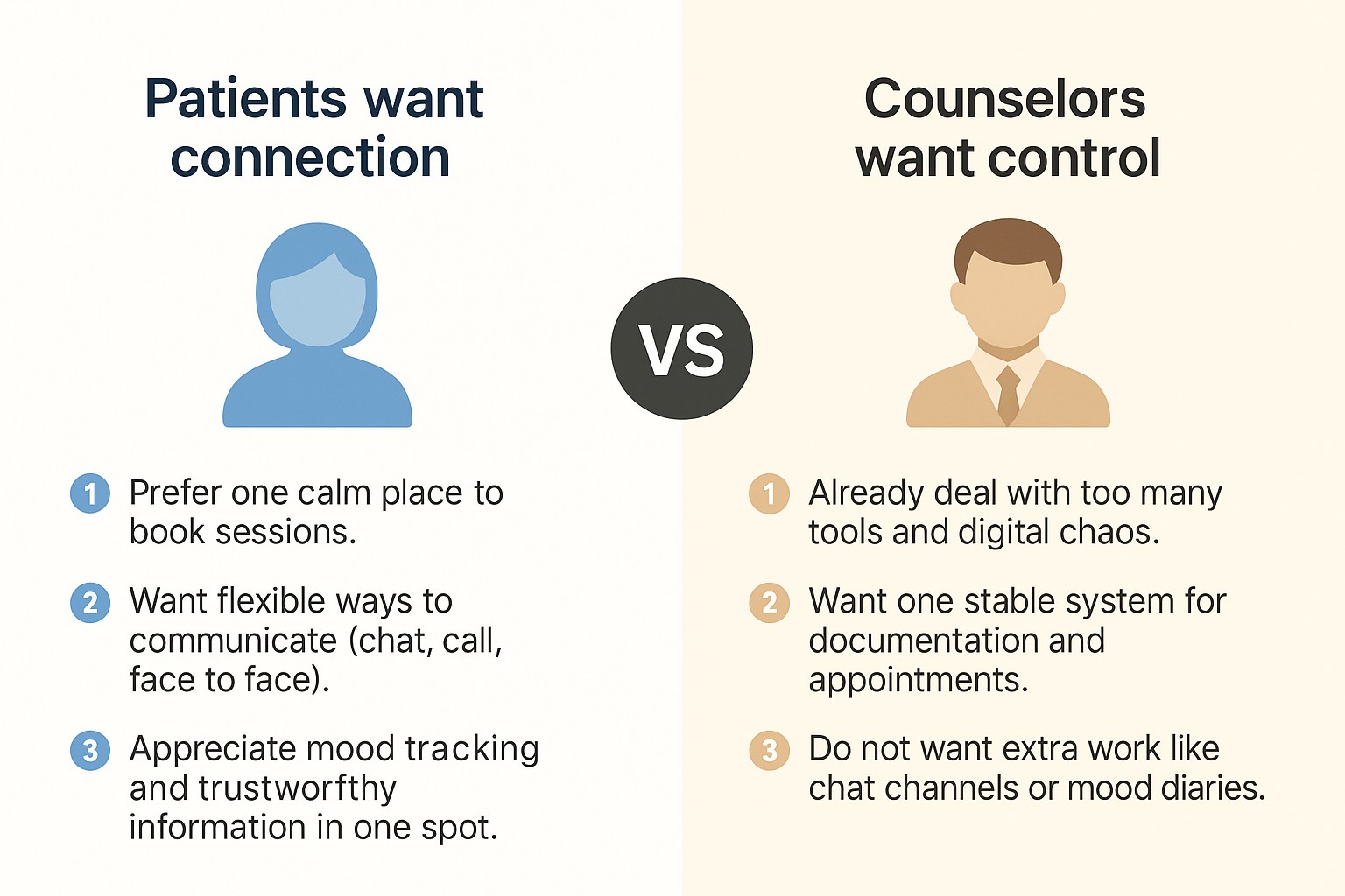 Our tests didn’t just validate ideas; they killed some of our favorites. When counselors said, “We don’t want chat or mood diaries,” we had to let those features go, even though patients loved them.