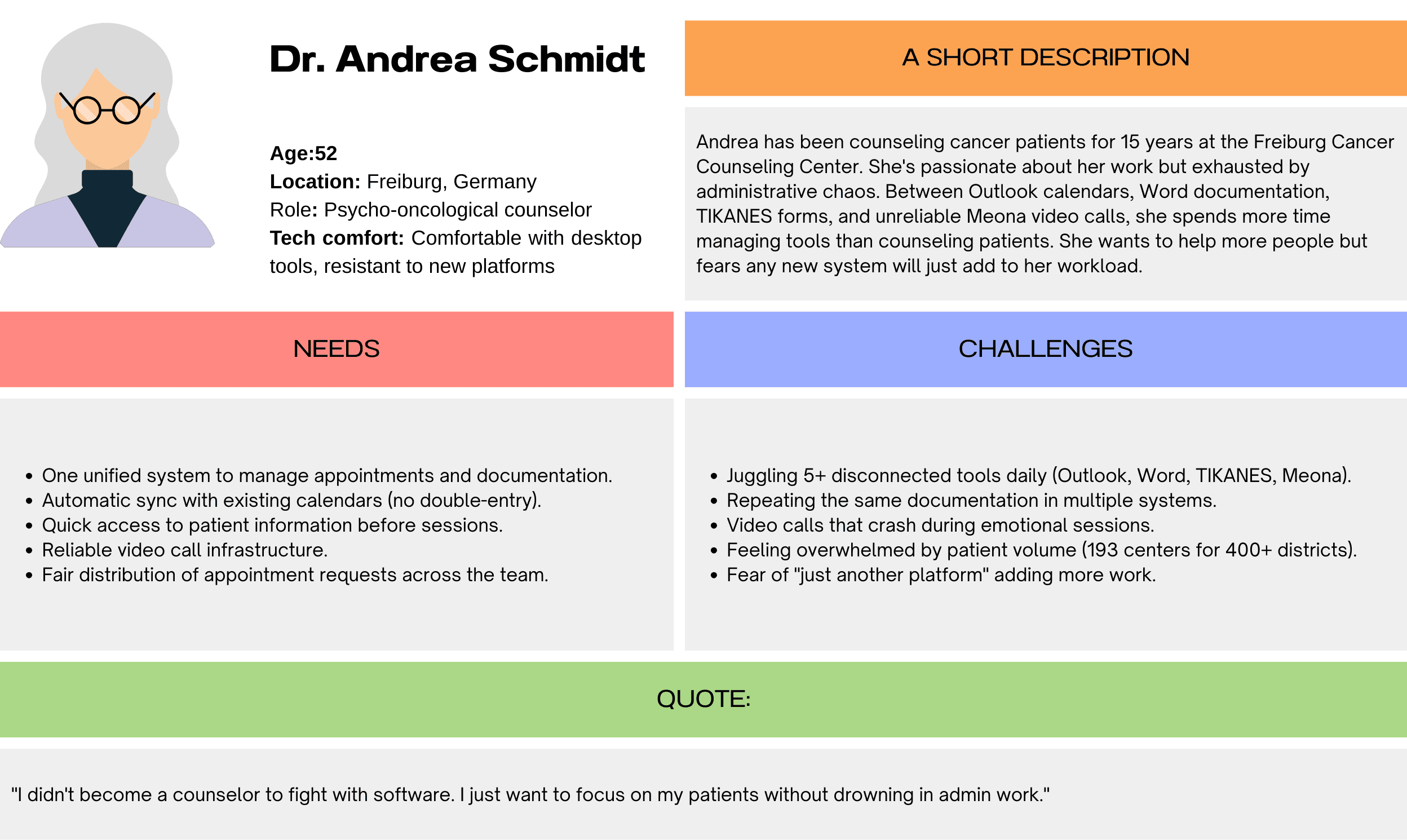 Until then, counselors had to use Meona for GDPR safe calls and scattered tools for documentation. During our tests, Webex was suddenly approved for video and Freinet was deployed for document management, so the core counselor problems were now covered. So the challenge shifted from building a replacement to designing around the new setup.