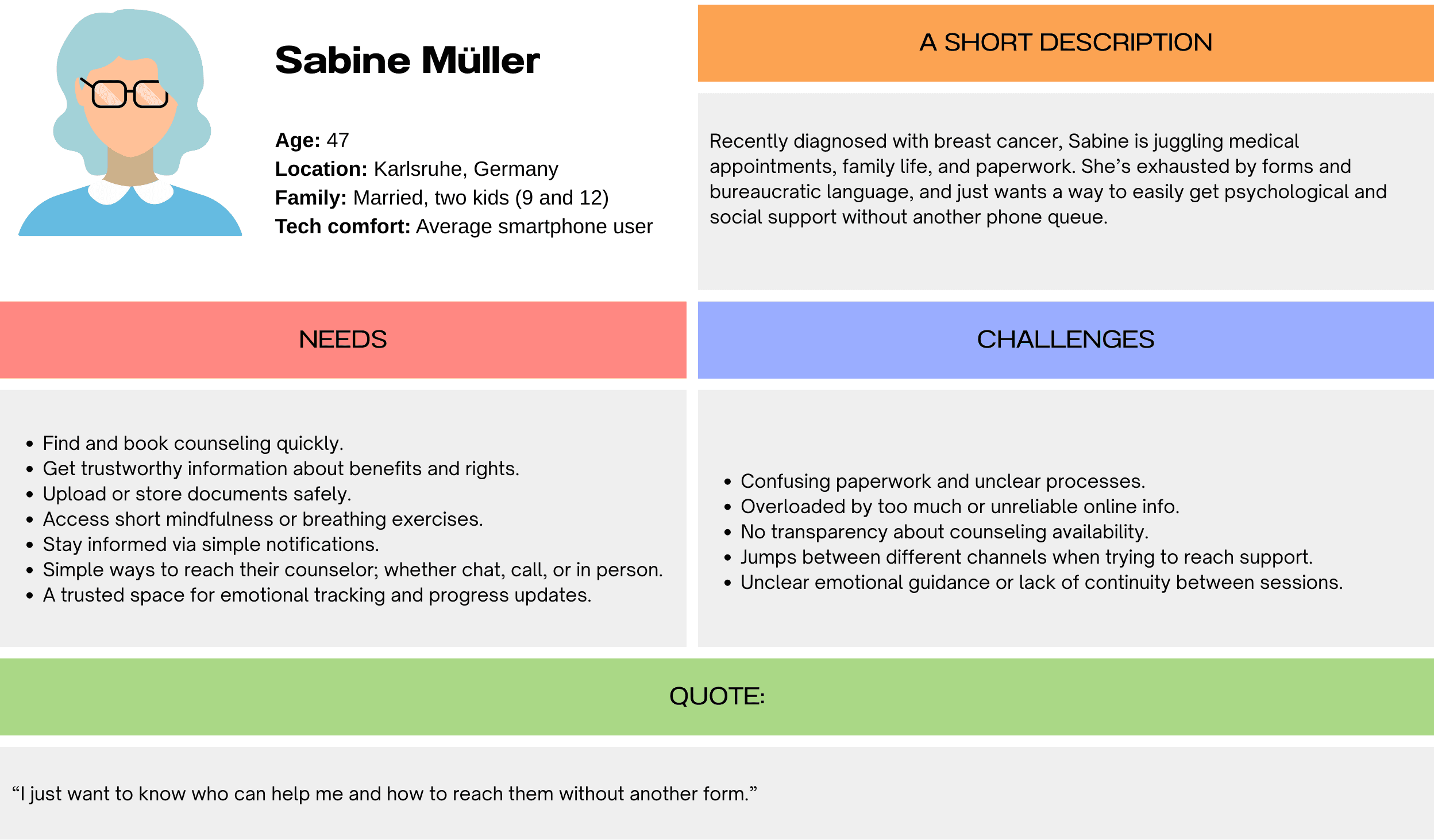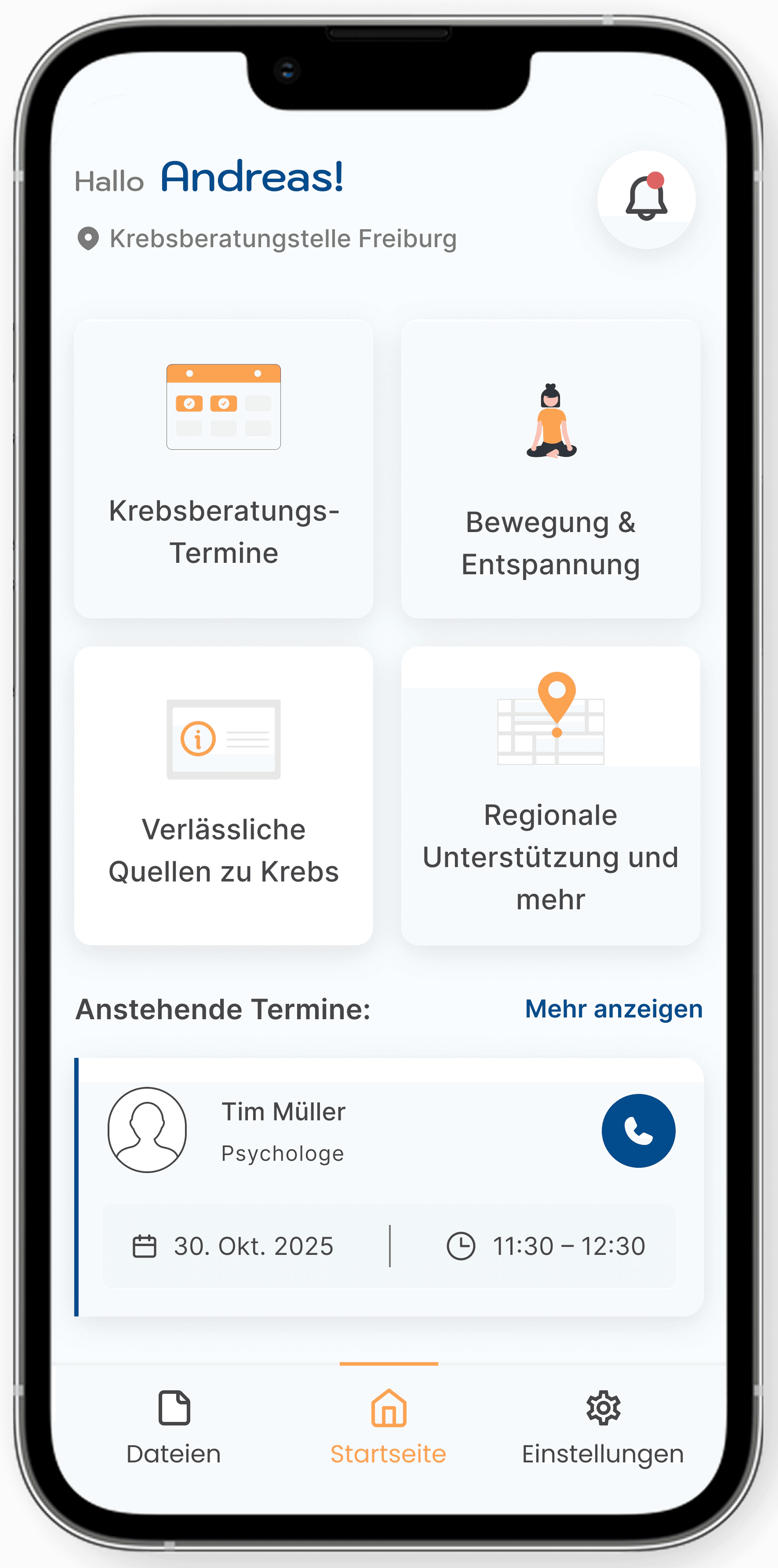 Patients seeking psycho oncological support often do not know where to start, get lost in paperwork and only find help by accident, while counselors juggle emails, documents and video tools with no single flow to book, share or start sessions. Fraunhofer ISI, Hochschule Heilbronn and the Freiburg Cancer Counseling Center teamed up to create one ecosystem, a mobile app for patients and a web app for counselors and I was brought in to design both.