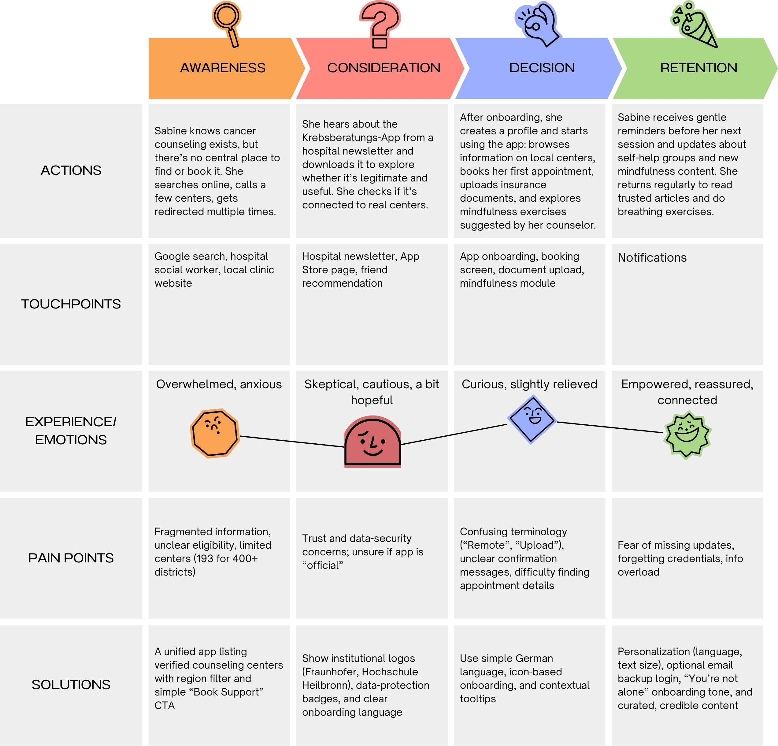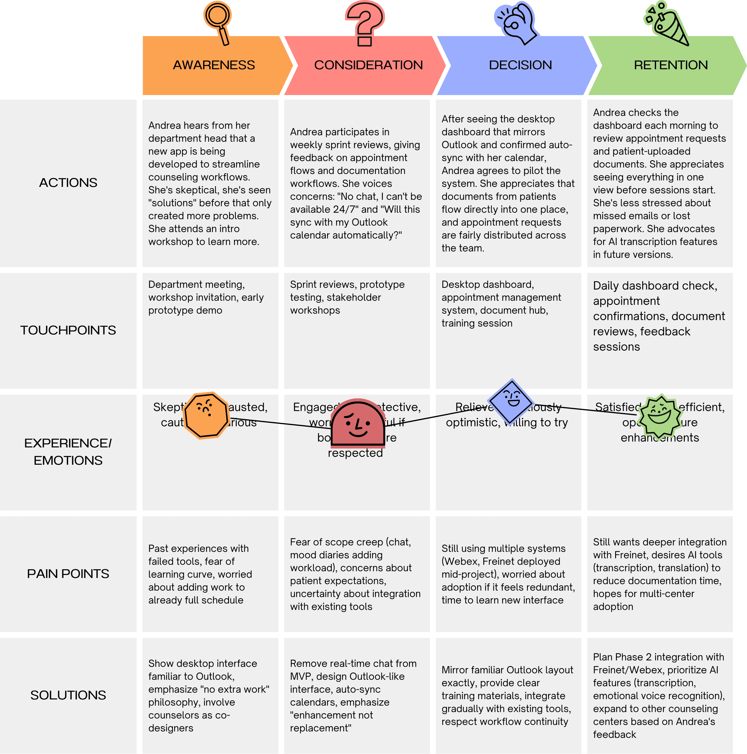 Using interview insights, I built personas and journeys that kept the team close to patients and counselors.