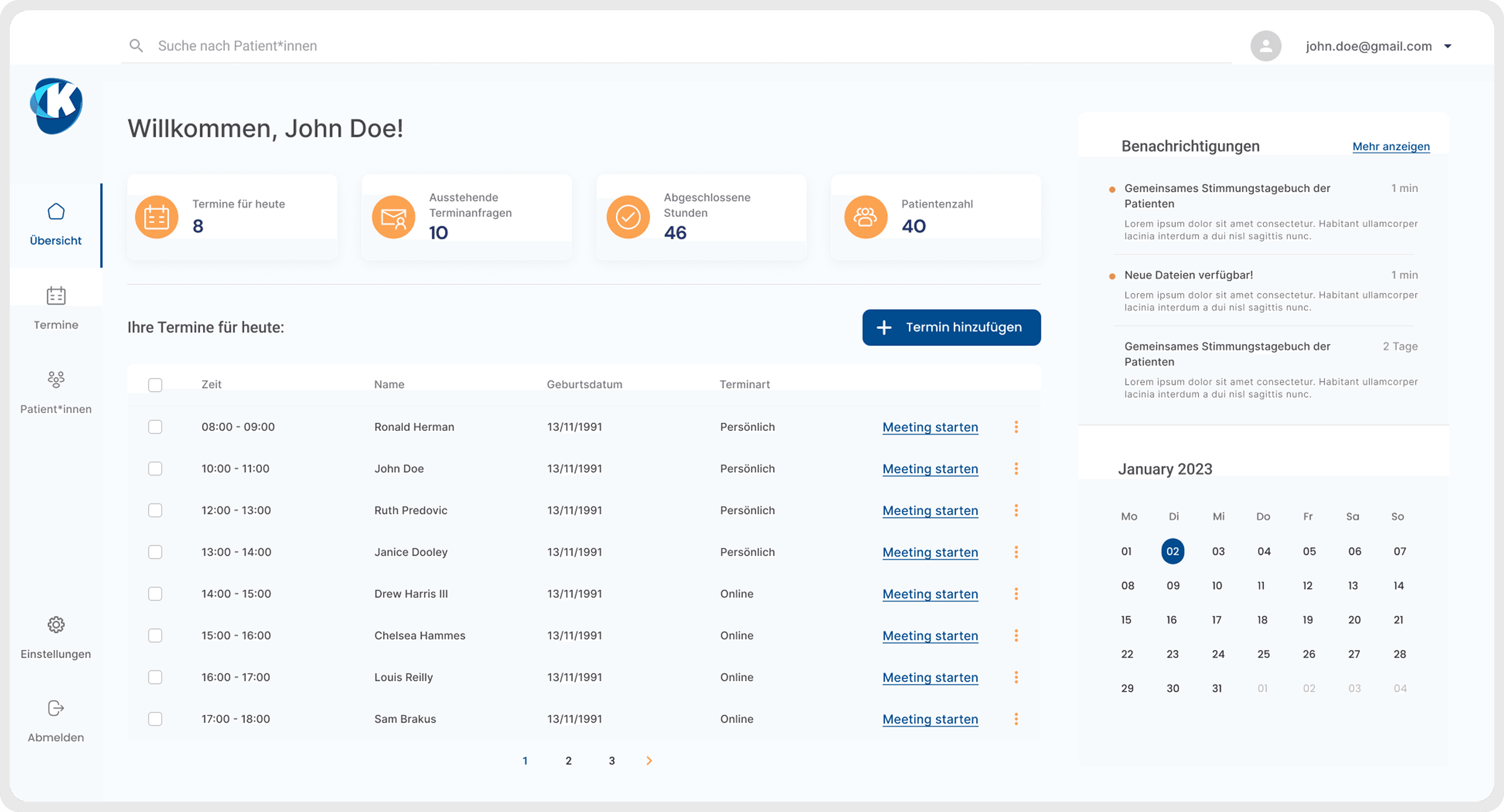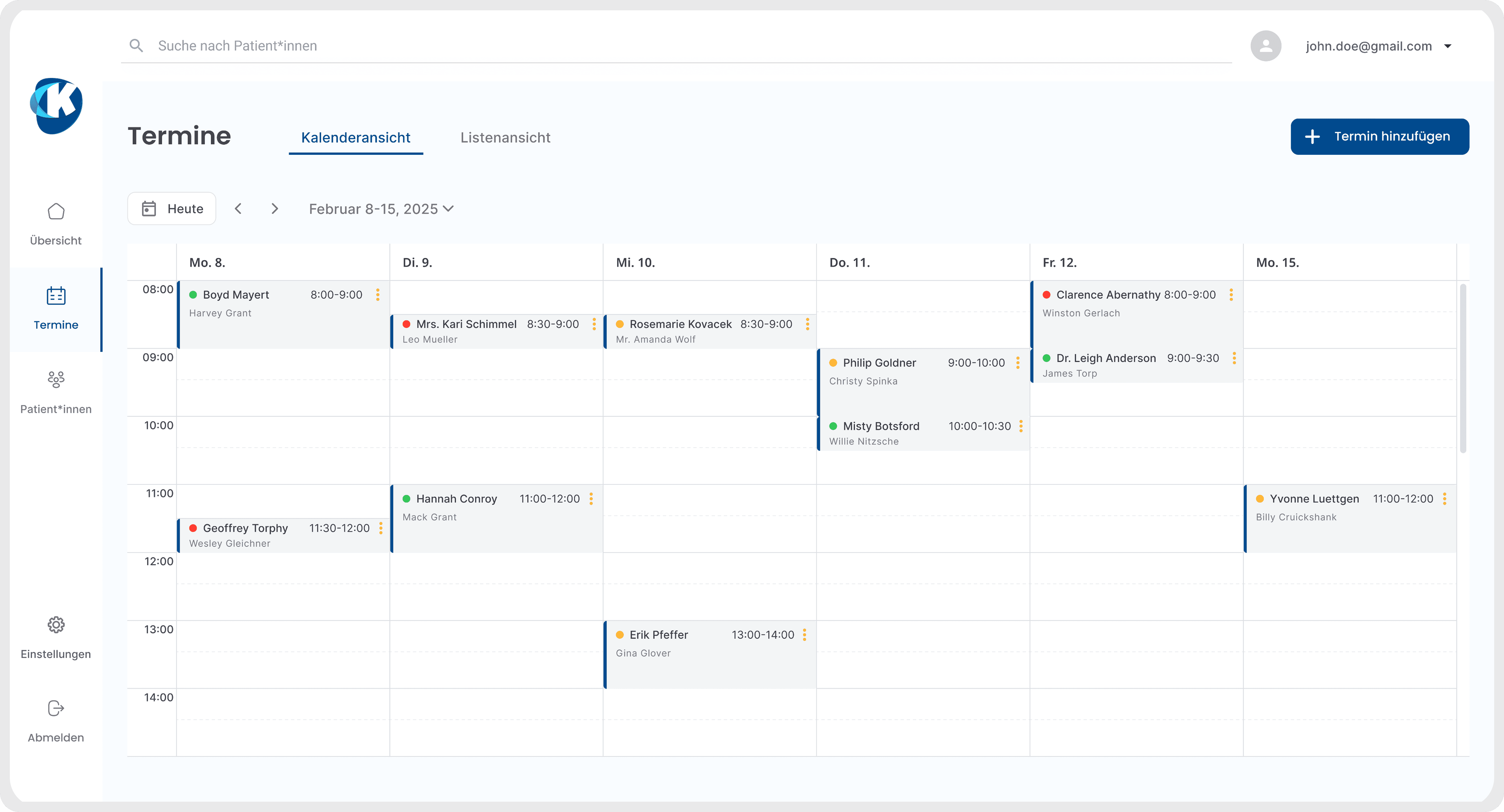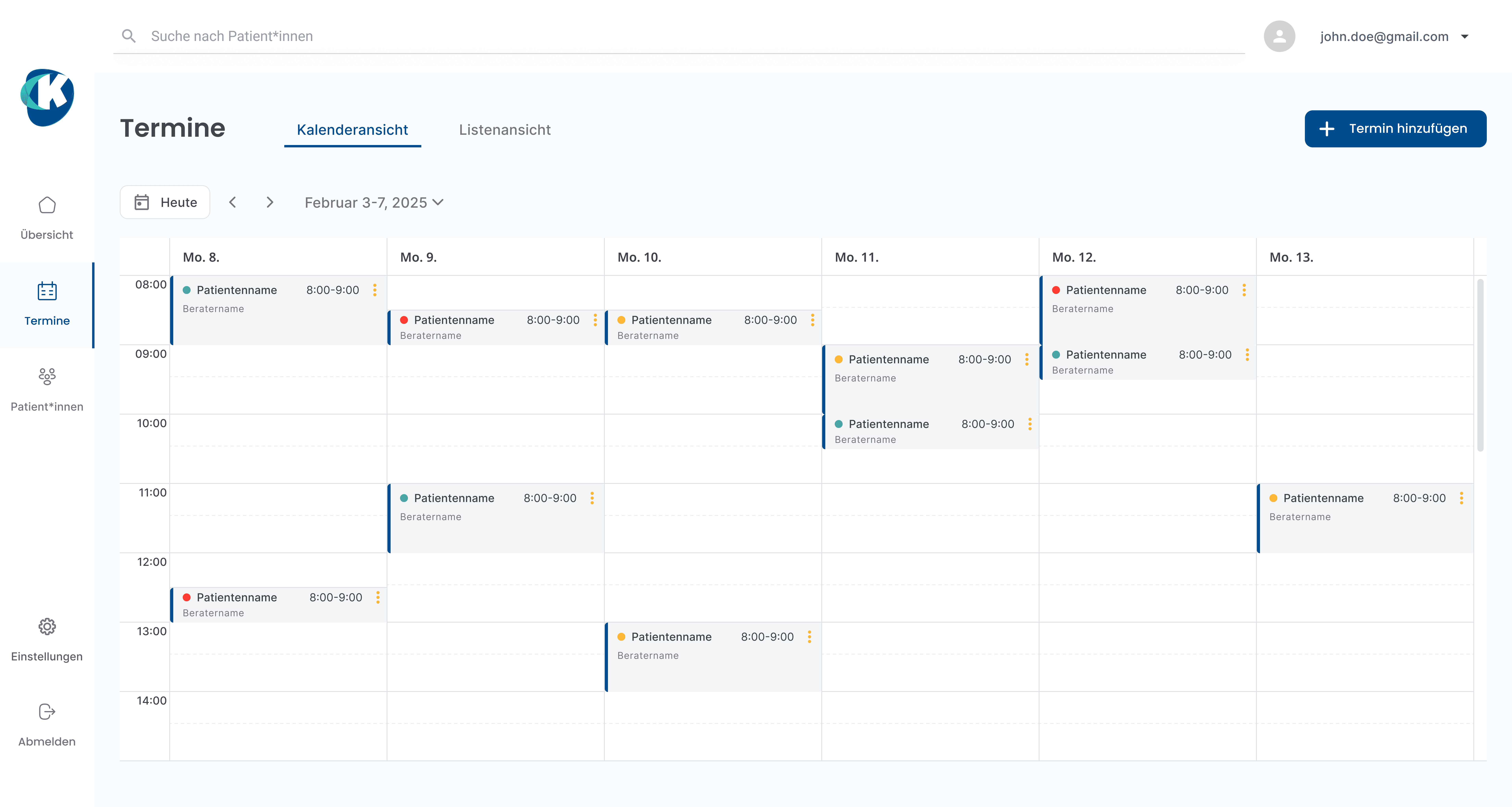 Interviews showed counselors already manage their day in Excel style tables and struggle when patient data is spread across tools. This list keeps all patients, contacts in one sortable view so they can search, open a profile, add appointments or safely remove outdated records in a few clicks.