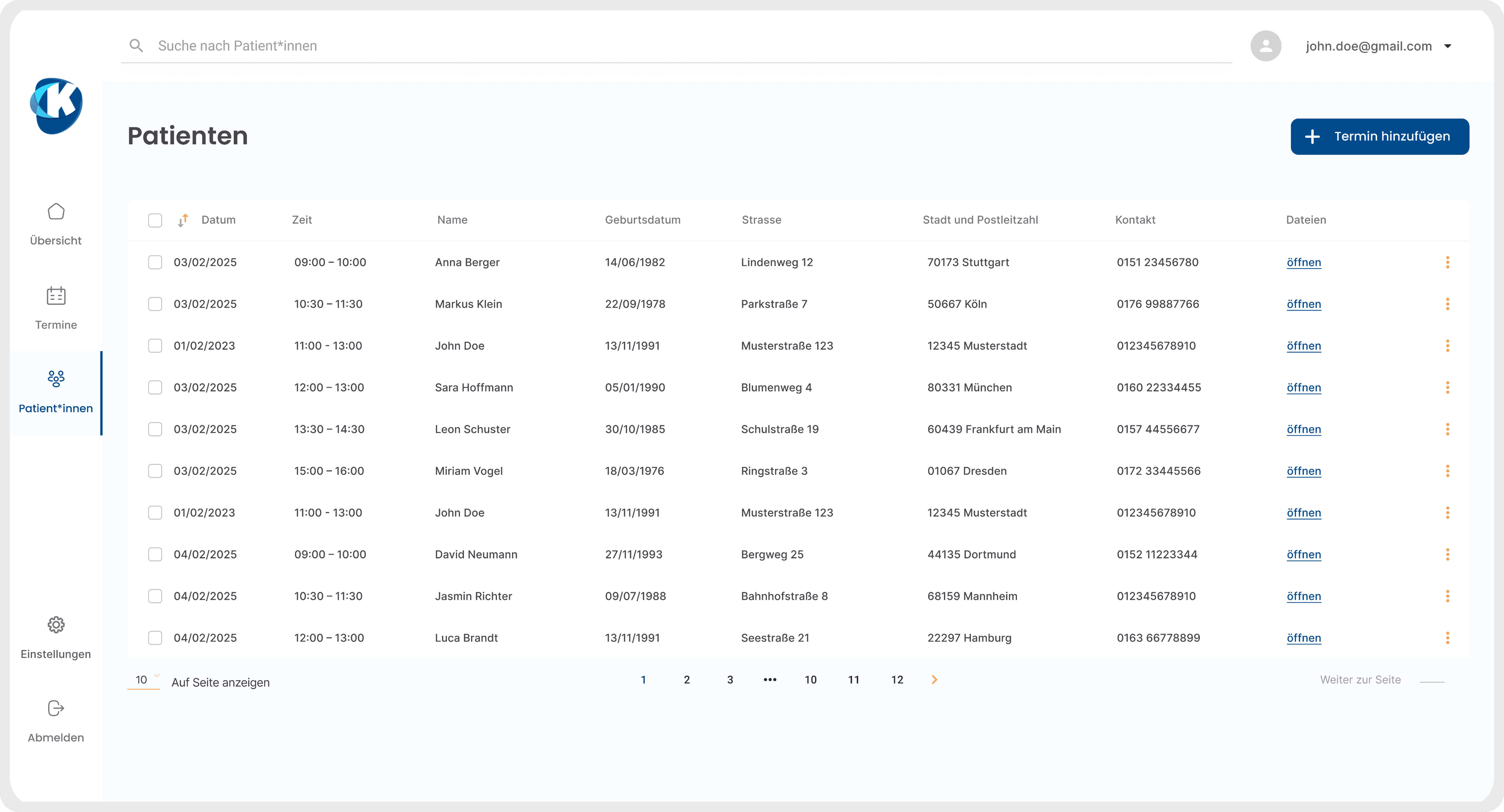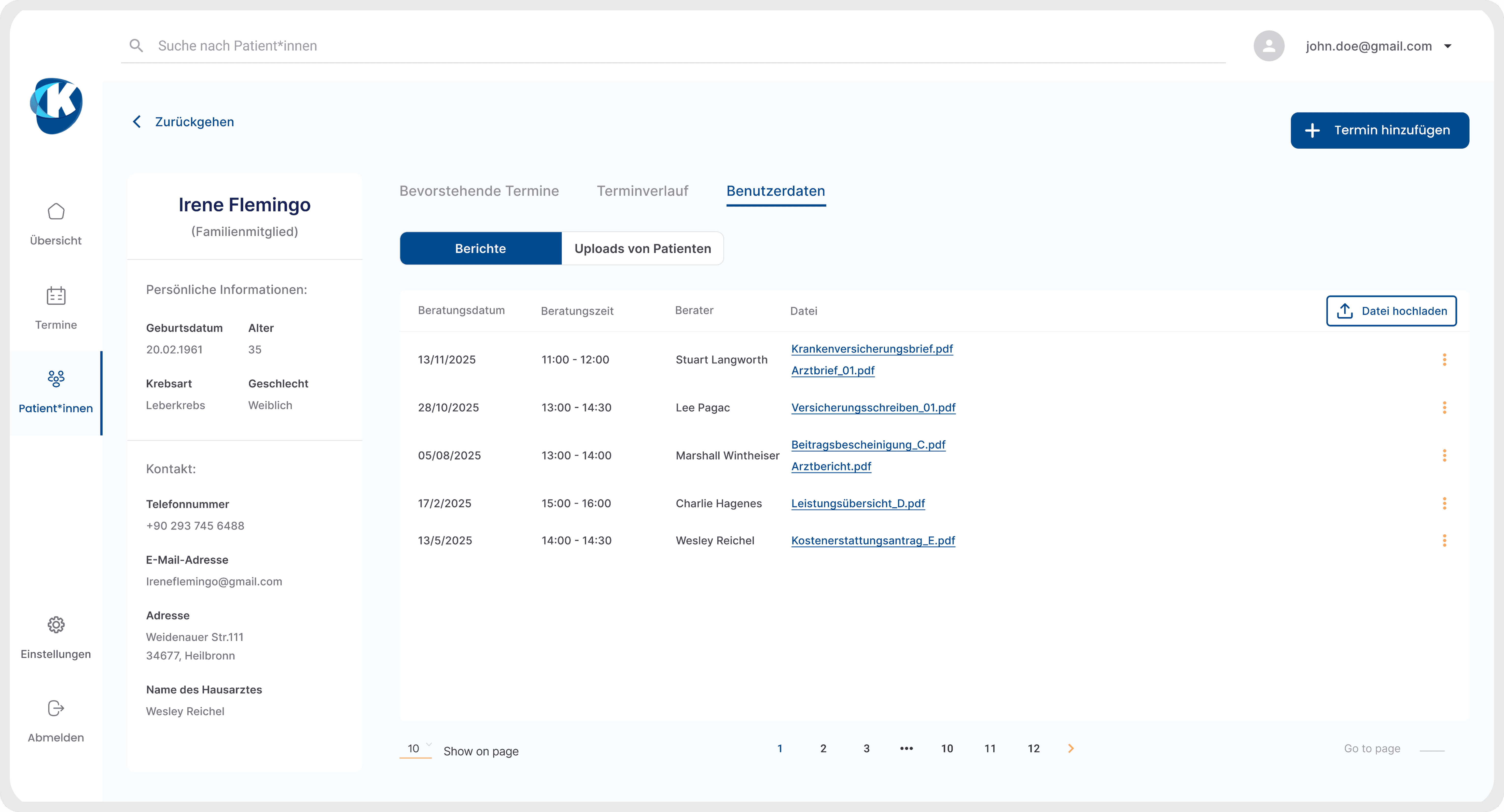 Counselor interviews showed documents were scattered across email, folders and paper. This table collects all files per patient, ordered by session, so counselors can see, open and upload documents without leaving the profile.