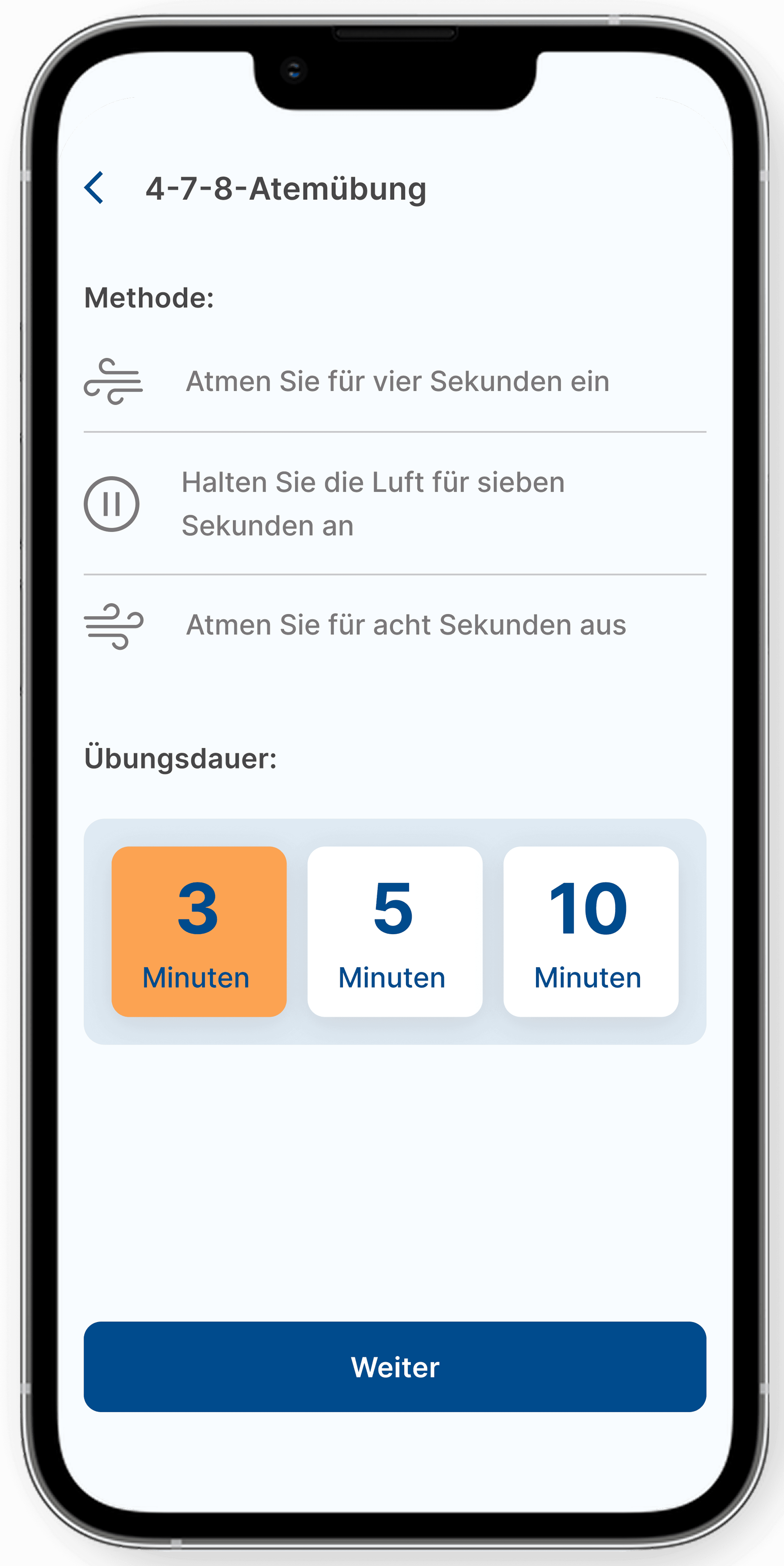 Patients asked for fast, calming exercises, especially during stress spikes. So this screen uses minimal text, clear rhythm cues, and a single action button to avoid cognitive load.